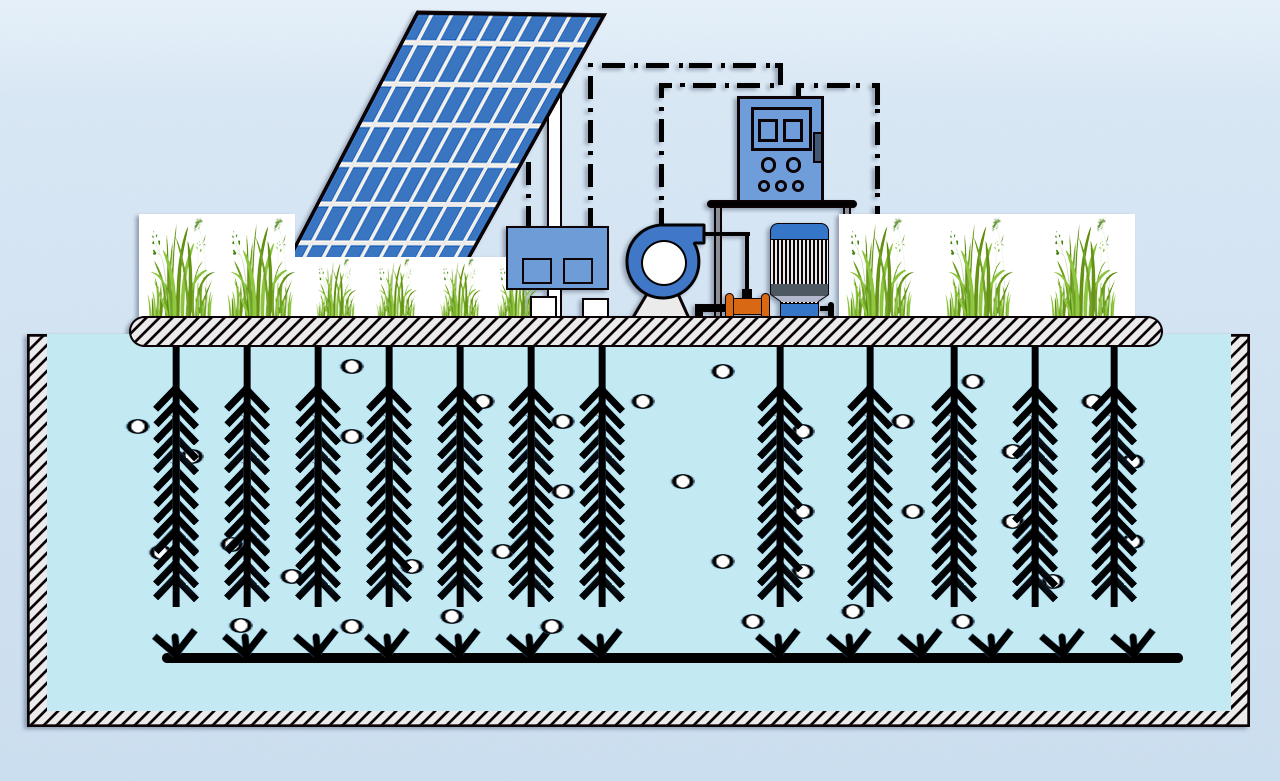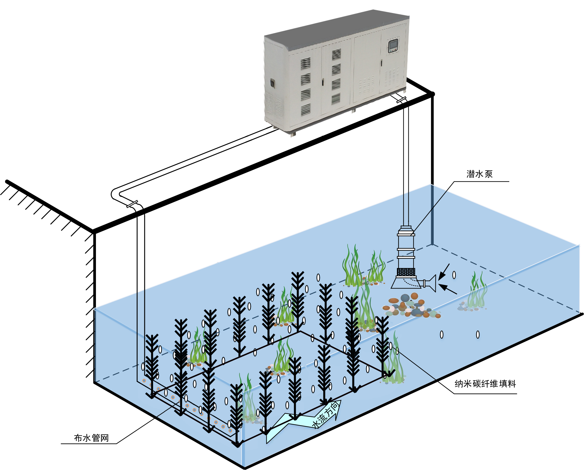 该体系是面向流域内水生态系统环境修复的产品体系,主要以高效富氧设备为核心,组合纳米碳纤维技术、接触氧化生态浮床技术、生态透水坝技术、生态湿地技术搭建集成的综合治理技术体系;主要功能是净化水质、恢复水体净化能力、提高水质质量,完善整体生态系统、维持生境平衡;解决水生态系统环境的不健全、不稳定等现象,丰富水生生物的多样性,防止返黑返臭现象发生;为用户提供流域水质提升、黑臭水体治理、水质净化提升、河湖生态修复等相关服务。 高效富氧纳米碳纤维(PO_CNF)产品技术: 高效富氧生物技术结合纳米碳纤维载体,为各种类型的微生物的高效繁殖提供有效的附着空间,快速形成生物膜。载体表面形成的生物膜以污水中的有机物为食料加以吸收、同化,高效生物浮床可以有效的发挥水生植物净化与微生物高效降解水体中污染的功能,对水体中N、P具有较强的净化作用。此技术适用于水流流速较大,水位较深的非行洪中小河流。 高效富氧生态浮床(PO_EFB)产品 接触氧化生态浮床的植物根系与底部悬挂碳纤维高性能条状填料相连,利用接触氧化法及植物根系的特性;为各种类型的微生物的高效繁殖提供有效的附着空间,快速形成生物膜,有效的降解水质,快速提升水体透明度。适用于水位过深、盐碱水质、水体污染,很多植物不方便直接栽植,耕地面积少、水域面积广阔的地区。 高效富氧生态透水坝(PO_PD)产品技术: 生态透水坝结合高效富氧生物技术,水中污染物在物理沉降、自然降解、水生生物吸收的作用下,净化水质。生态透水坝利用物理过滤、植物吸收和微生物降解。物理过滤在于堆积坝体的滤料之中形成许多空隙,污水在经过生态透水坝时,水中的污染物被吸附和拦截下来。生态透水坝上种植的水生植物产生的大量根系深入坝体,吸收水中的营养盐和重金属。许多微生物和原生动物生长于滤料中,它们利用污水中的营养物质生存和繁殖,进而净化了水质。适用于流速缓慢、污染严重的非行洪中小河流。 高效富氧生态湿地(PO_CW)产品技术 高效富氧湿地产品将纯氧设备与模块化的潜流湿地相结合,依靠生物处理技术联用,再生水在进入河道前,先经过人工湿地处理,再进入推流富氧生物处理技术系统。进入人工湿地的再生水呈波形流动,使其在垂直方向上多次经过湿地内部具有不同处理特性的构造层以调节再生水在湿地内的滞留净化时间,从而强化对河道水质的净化效果。